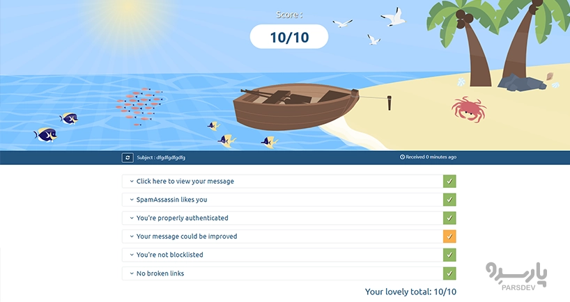 - ایمیل را به آدرس موقت Mail-Tester ارسال کنید.