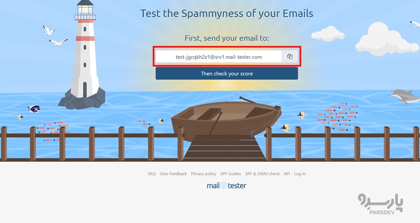 - پس از ارسال، به وبسایت Mail-Tester برگردید و روی دکمه Then check your score کلیک کنید.