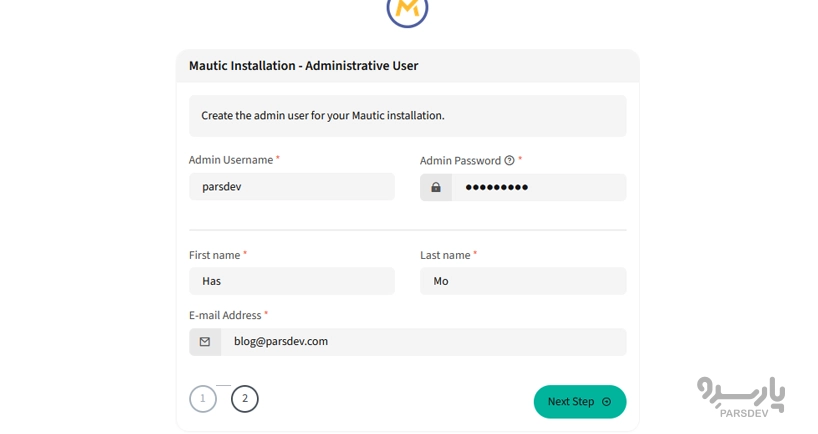 پس از انجام این کار، یک فرم کاربر مدیریتی جدید نمایش داده میشود. یک بار دیگر، اطلاعات مدیر و ایمیل خود را وارد کنید و سپس روی دکمه «مرحله بعدی» کلیک کنید.
