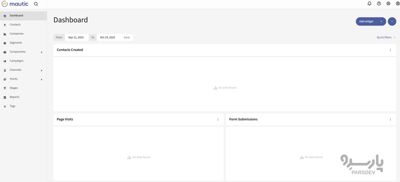 پس از انجام این کار، ما باید آماده استفاده از نرمافزار Mautic باشیم. میتوانید ادامه دهید و مخاطبین، بخشها، کمپینها و موارد دیگر جدیدی ایجاد کنید. لطفا مستندات رسمی Mautic را در مورد نحوه انجام آنها بررسی کنید.