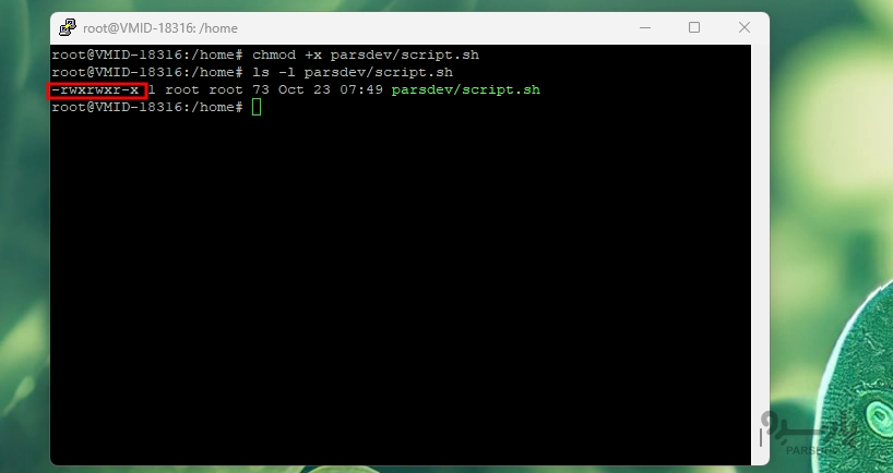 برای اجرایی کردن اسکریپت script.sh درون دایرکتوری parsdev: