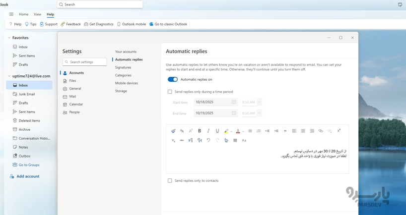 - روی Account و بعد Automatic replies کلیک کنید.