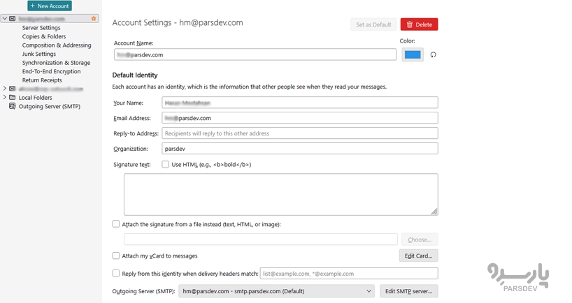 - Outgoing Server (SMTP): mail.yourdomain.com (پورت ۴۶۵ یا ۵۸۷)